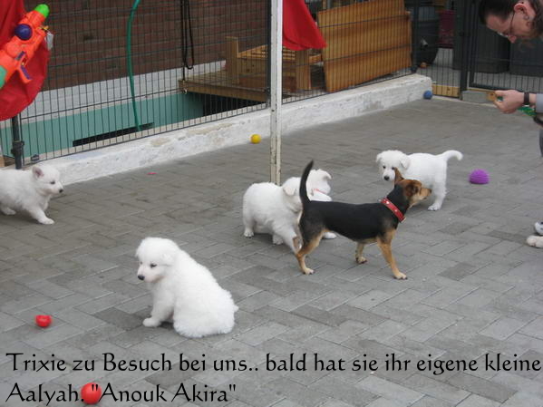 Gaby und Bernd waren mit ihren 2 "Fußhupen" Trixie und Sunny hier.. Die beiden sind nicht wesendlich größer als unsere Welpen... Und waren schon baff, verwirrt, überrumpelt... von den vielen weißen kleinen Wollknäueln. Die schüchterne Sunny ist dann auch geflüchtet ... Trixie hat sich teilweise dann doch erweichen lassen.. Aber wir haben nichts anderes erwartet... Und eins wissen wir jetzt schon.. Trixie wird Anouk lieben! Denn sie steht auch total auf Aalyah.. Nun hat sie bald ihre eigene kleine Aalyah :)