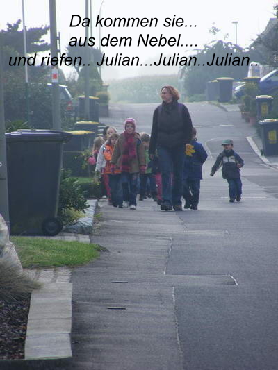 Sie sind morgens 1,5 Stunden lang vom Kindergarten zu uns gelaufen. Haben Blümchen für mich und Julian geflochten.. Julian an draußen an der Straße gewartet, und dann kamen sie endlich die Straße runter. Riefen laut Julian.. Julian... Julian..