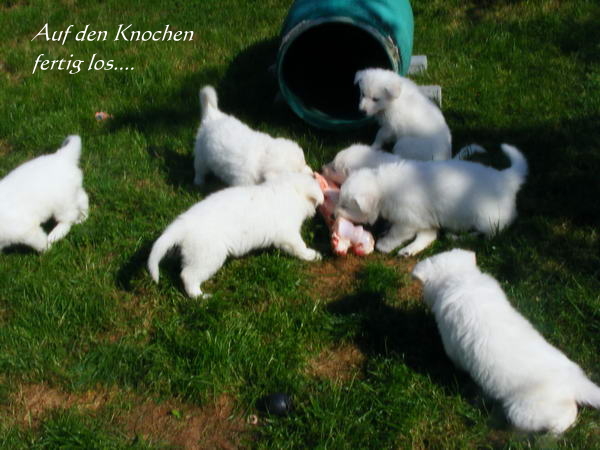 Wir haben wie gesagt das Futter auf 4 mal täglich erhöht. Und seit heute wird es nur noch eingeweicht... nicht mehr püriert. Außerdem steigen wir gerade langsam vom Bosch Puppy auf das Bosch Junior Bigger Bread um. Was die Welpen auch bis zu ihrem 1 Lebensjahr weiter bekommen sollen.