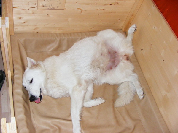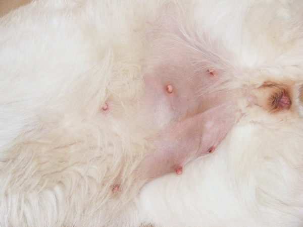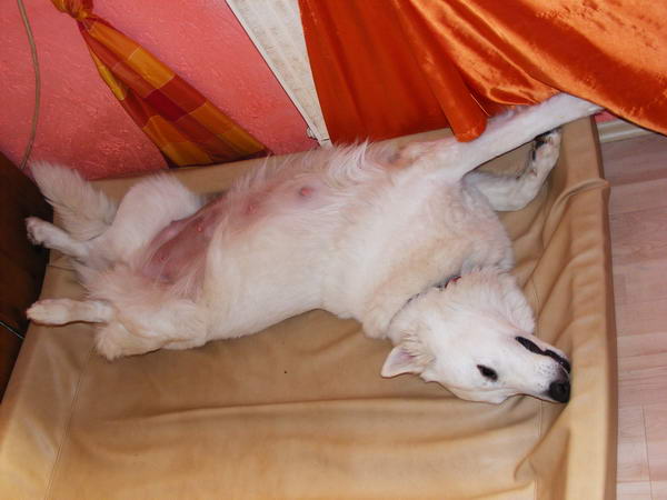 Wie man hier sehen kann, hat sich der Bauch mächtig gerundet, und die Haare um den Zitzen fallen aus. Die Zitzen sind groß und rund und die Drüsen schon mit Milch gefüllt.