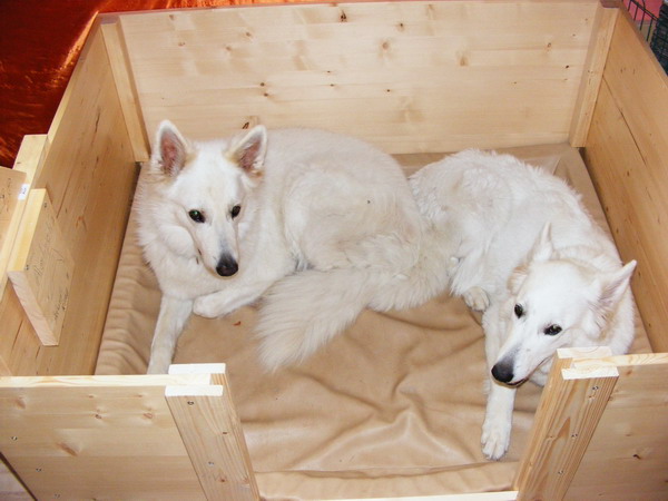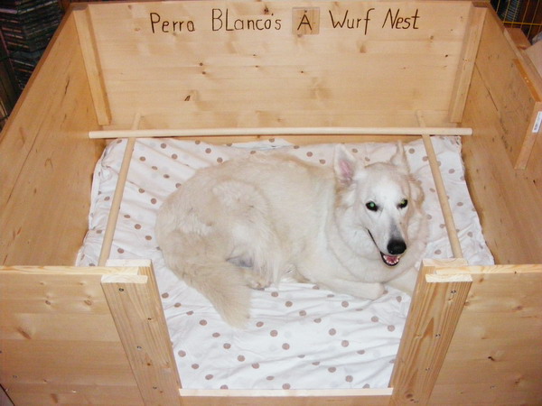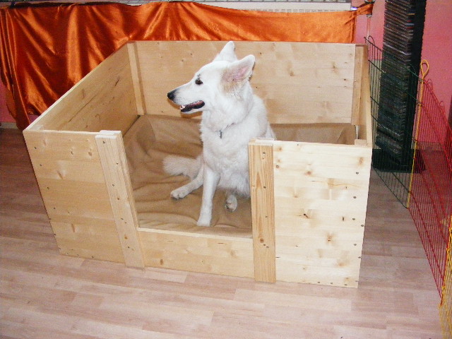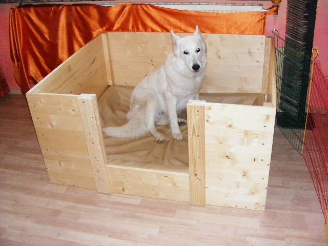 Heute ist die Wurfkiste endlich fertig geworden. Einzig der Schriftzug auf der Rückwand fehlt noch.. Aber das mach ich gleich noch! In den Eingang kann man noch 2 Bretter rein schieben. Um die Welpen erst mal an den "Ausbruch" zu hindern! *gg*