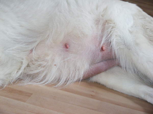 Hier ein Bild direkt vom Bauch. Man sieht wie die Zitzen groß geworden sind und auch die Vulva ist nach der Läufigkeit nicht wieder ganz abgeschwollen. Hätte sie nicht aufgenommen, wäre die Vulva wieder auf die normale Größe geschrumpft.